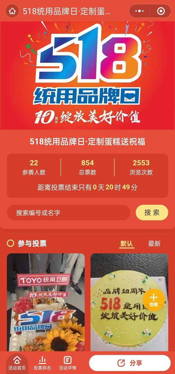 全国统用人齐齐更换518头像为品牌助力发声,表达全国各地客户的热情祝福,凝聚品牌向心力,统用品牌中心更组织号召大家,以“定制主题蛋糕送祝福”参与活动,庆祝518五周年快乐,并通过投票选出人气奖予以奖励。
