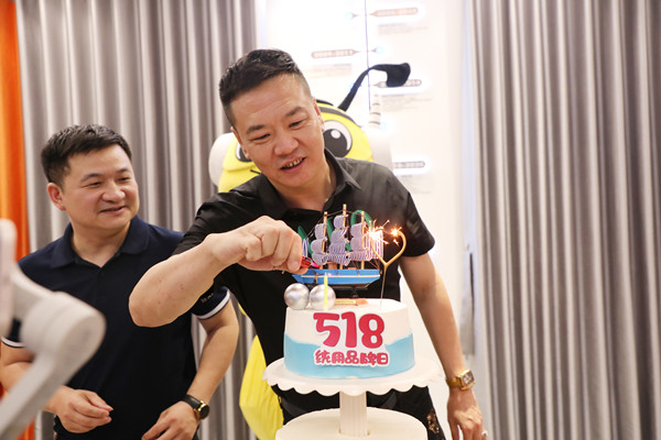 活动现场,统用公司董事长陈大航为518品牌日切蛋糕,向全国统用人送出诚挚祝福。