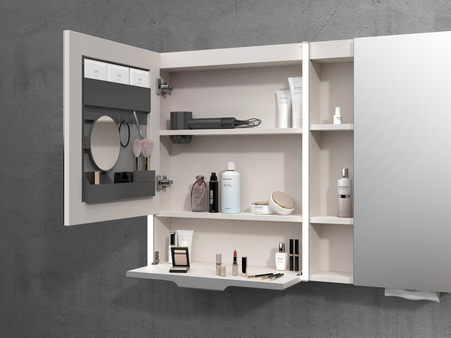 乐心套间组合为用户提供便捷的浴室空间解决方案,省去用户为不同浴室产品搭配的烦恼。打破了现有浴室柜空间功能单一的特点,满足用户的个性化需求。浴室柜主体采用了没有攻击性的奶油色系,营造温暖、明亮的空间效果。主柜门板上装饰有细腻的肌理线条,令整体视觉效果更富层次感,久看不厌。许多爱美人士曾遭遇浴室空间较小、台面空间不足导致的化妆时物品拿取不便的问题。乐心浴室柜通过一个小小的翻抽解决了这个痛点。拉下镜柜左侧的翻抽,一个小小的临时置物搁板便出现在眼前。打开右侧柜门,选取本次所需的美妆用品放置在小搁板上,便可以开始打造精致妆容。