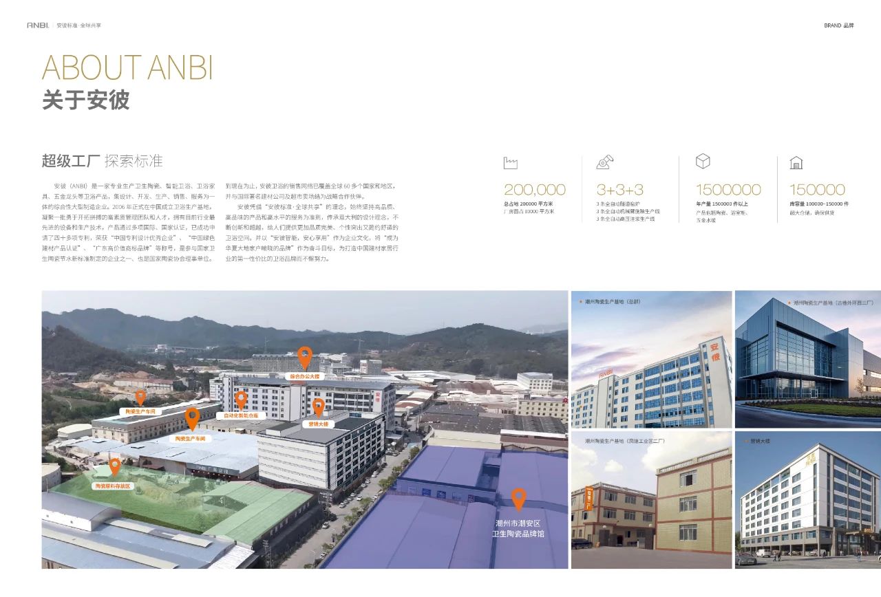安彼卫浴成立于2010年,是一家集研发、生产、销售于一体的综合性卫浴制造企业,拥有陶瓷、浴室柜、五金三大生产基地,占地面积多达100多亩,并配备国际领先的隧道窑炉、全自动生产线及智能检测实验室,构建了覆盖原材料采购、生产制造、质量检测的全流程高标准管理体系,产品线涵盖陶瓷洁具、智能马桶、浴室家具、五金龙头等全品类卫浴产品,形成“一站式”解决方案能力。