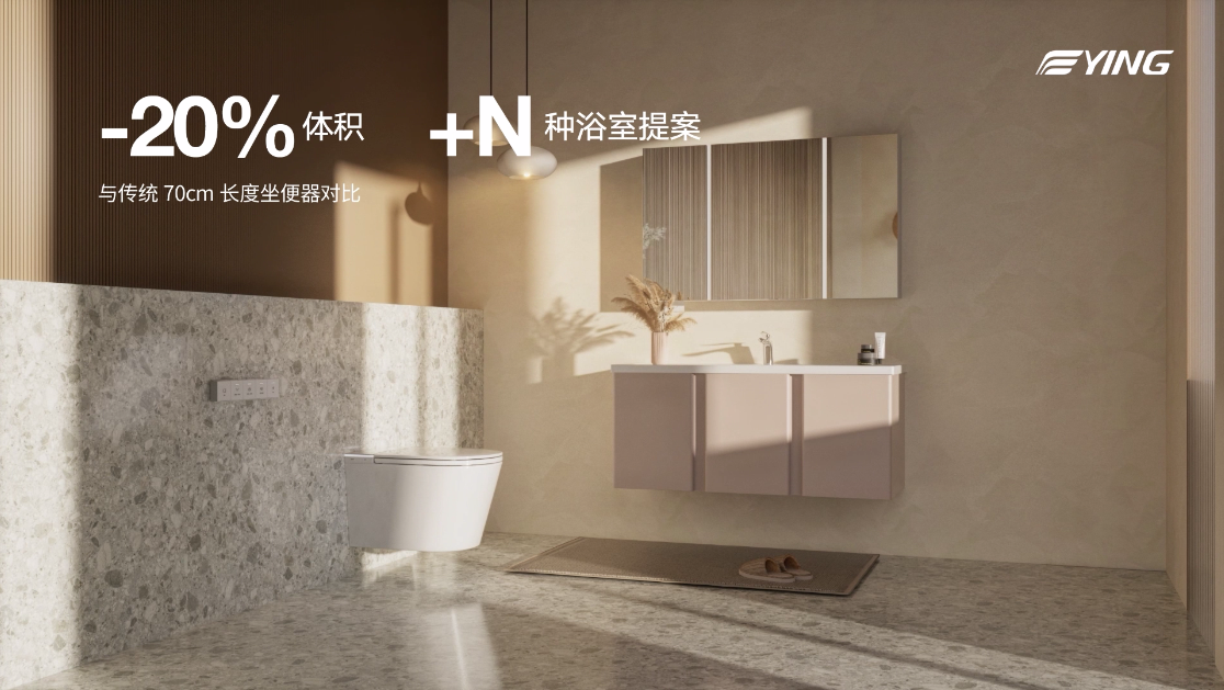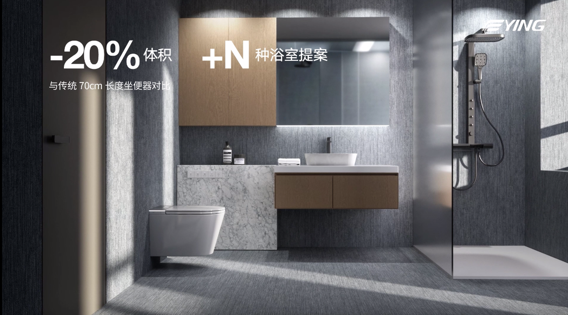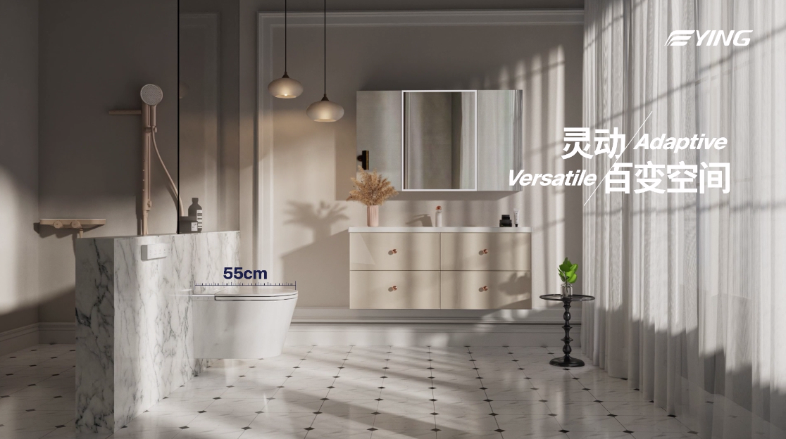 灵动百变+N种浴室提案:INNO灵巧的尺寸,比传统智能坐便器小20%,搭配EASY+灵动支架,轻松安装在不同格局的卫浴空间。