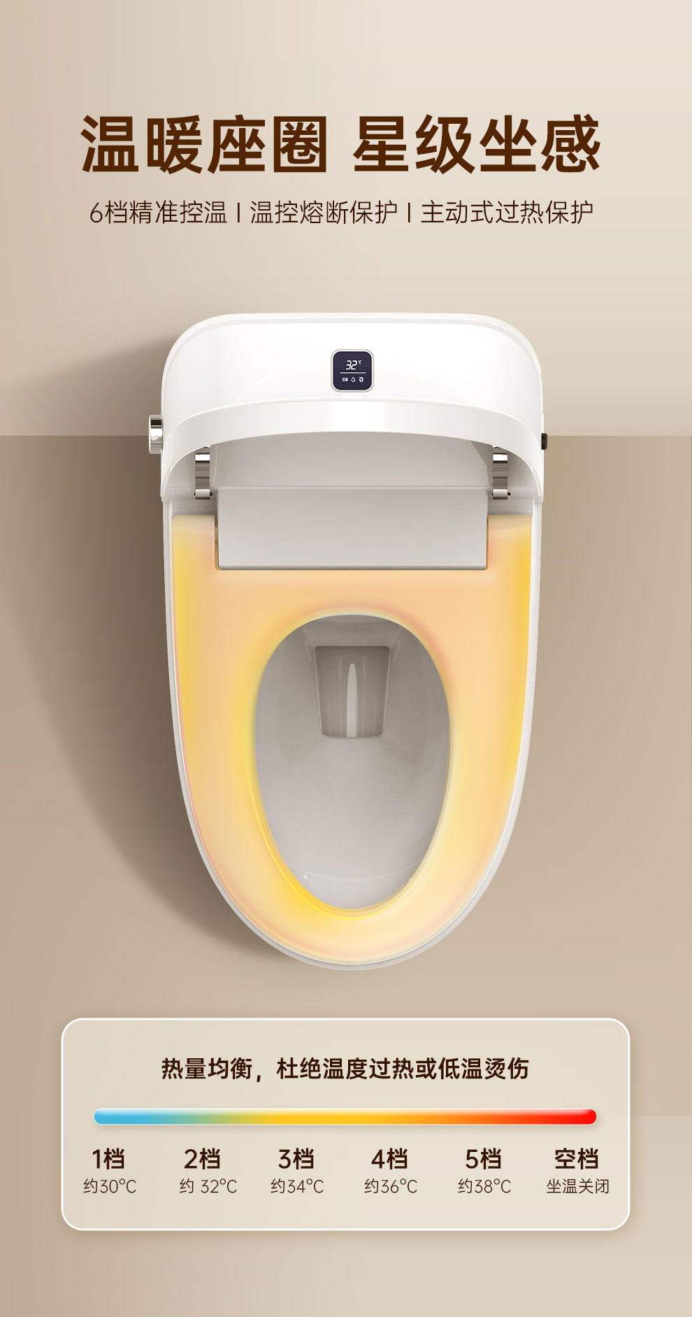 此外,它还拥有独特的人体感应脚踢翻盖,避免误识别,以及智能大小便识别和独创的二次冲水技术,能更大程度保持马桶洁净!